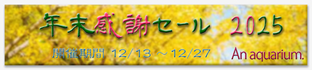 おさかな・みずくさ・流木や石としたレイアウト素材・ADA製品などを、みなさんへの一年の感謝の意を込めましてしっかりお値下げしご奉仕させていただきます。期間中は何度も足をお運びいただき、"今年最後の無駄遣い"をお願いしたいと思っております。