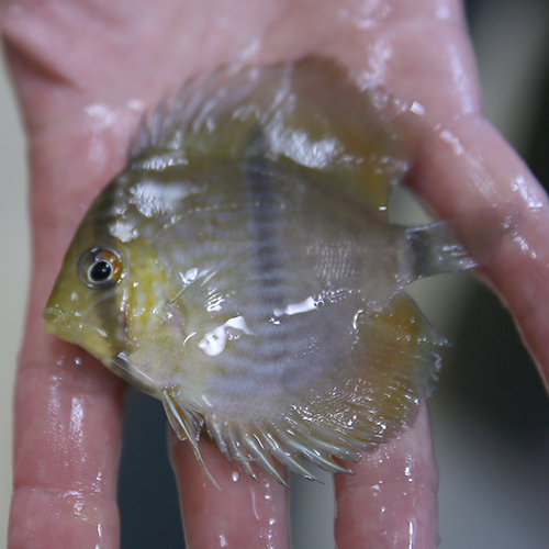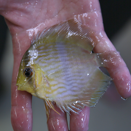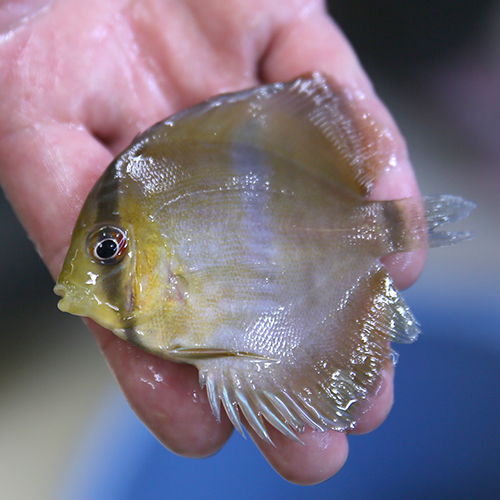 として、仕入れも安くはなくなってしまったこのおさかな、今週も残っていれば何匹かさらってこようと目論んでたけど、なんとも水槽が空に。かろうじて同便で来た小さめサイズが残っていて、最後にさらってきました。今季ディスカスの仕入れ、これで最後になりそうだったから、できるだけたくさんと思っても6尾のチョイスで手を止めました。その中からいくつか手乗りで紹介。