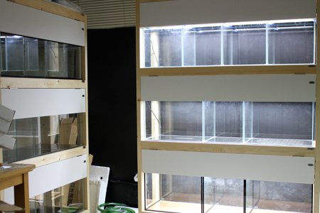 さて、An aquarium.では、先週くたびれて途中でやめたバックヤードの水槽のスタンバイをしています。今日のところはエアーコック付き配管と、水槽を少し列べて置くところまでで夜中の3時。春に準備した特殊サイズの水槽をいくつかと、ほかにも45・30C・36と、サイズもさまざま導入します。
