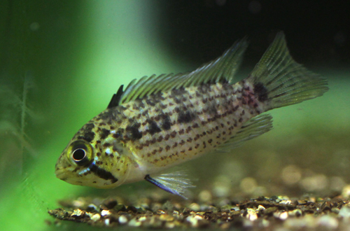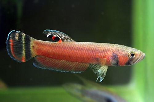 ご覧の通り、尾ビレは立派なスペードテールに。上端の縁取りが、背ビレから続くように赤が入るのも特徴です。肩赤になってきたり、個体差か地域差なのかは分かりませんが、そうした様子もよく見受けられる種類です。画像ですと分かりにくいのですが、腹部に波状のラインが出るのも傾向で、小さなサイズでもこの点と尾ビレの格子状の模様の差などで、慣れてくると見分けがつくかも知れません。水槽に収容し実際に飼育してみると、ペルテンシスの性格と言うよりはむしろロートカイル系の性格と振る舞いです。顔と背ビレの高さがペルテンシスによく似ています。背ビレ前部の条は少し離れて尖っています。エリザベほどではありませんが、前から3本ないしは4本だけ先端が尖り少し伸びてゆきます。この種類、ペルテンよりもはるかに得した気分にさせてくれ、ロートカイルやエリザベに飽きた方でもドキドキさせてくれるステキなおさかなです。普段は少数しか入荷がなく、ご提供できる数にもいつも制限があることがたいていですが、ほどほどの数をWB.SABBYの山本氏からお送りいただいております。といっても50尾未満ですので、頃合いを見計らい、お好きな方は入手しておいてください。不定期入荷につき、常に供給できない種類です。よってしっかり高いレベルでの仔取りまでお願いしておきます。上位個体が欲しいときは、おはやめにアクセスください。良いところからリリースさせていただきたいと思います。