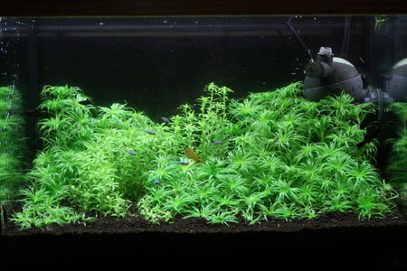 単植でも十分にきれいな水草です。トニナは難しいのではなくて、「育生条件を揃えてスタートするコツがある」というだけの水草です。それを知っているヒトに聞きながらやるのがすばやくマスターするコツなんです。育てられて喜んでみたら、次のステージではその環境を利用して、多様多種の水草のレイアウトに持ち込むことができたり、使用した水草の種によるKHのコントロールで、生長速度のコントロール・サイズのコントロールができるようになります。「低KHの水草水槽の世界」のマスターは、ご自分の水草水槽環境の幅を広げてくれる重要なポイントになってゆきます。水草のポイントは「KHコントロール」、これで初めて見えてくる次の水草水槽の世界があるのです。