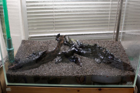 ADAへの「参勤交代」から戻り、早1週間。せっかくだから「ネイチャーアクアリウム」的レイアウト水槽を1本、An aquarium.の店内におみせしてみようと目論んでおり、本日ようやく120をひとつ空にしました。