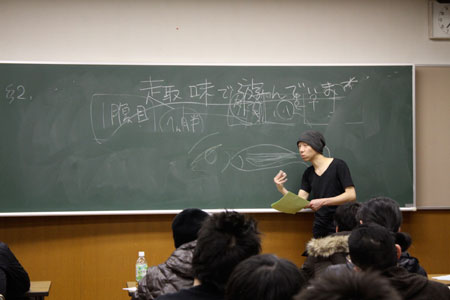 みなさんのまなざしが真剣です。空白のゼミパンフが、徐々に自分色に染まってゆきます。ハイレベルゼミ、サカナ向きで考えての視点。少しまた新たな視点で物事を考えてみる。『自分向き』って、なんなのだろうか。それを知るきっかけとして、今回の内容を反芻していただければこれまたナイスな機会になりました。
