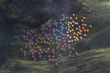 そして本日、ご来店のお客さまが産卵しているのを発見なさいました。蛍光灯を増灯せずに撮影したこともあって、画像のオス色は飛んでいます。前回卵が消滅してからは、今日でほぼ2週間ほど経過しています。次の産卵時期がこの日だったわけですね。