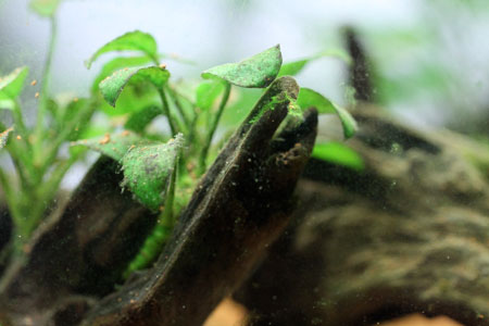 活着モノの育生状況は、こうした水槽ではあまり期待できない。多くのアピスト水槽では低KHで維持されることが多く、さらにはこうしたスポンジ水槽ではCO2添加は皆無。辛うじて生きながらえている状態と言える。ここではもっぱら流木以外の障害物としてとらえ、枯れていないことを確認する程度でよい。こうした活性の低い水草の導入時には、ここからコケが生え始めるので、ここは逆にコケの具合のバロメーターとして受け止めます。アピストが卵を産んだとき、その水槽の雰囲気はどんななのか、まっさらなコケなし状態では意外に産んではくれない。うっすらとコケの発生が見え始めたあとで、その一連の動作が始まることが多い。水槽全体のコケの程度、これも画像から知ることのできる貴重な情報のひとつとなります。
