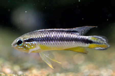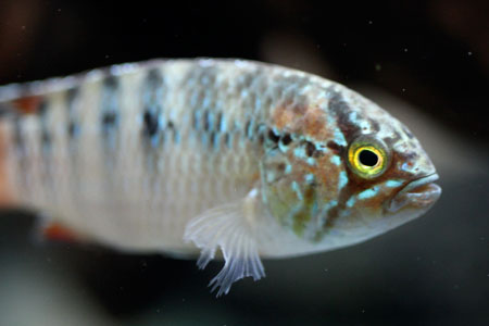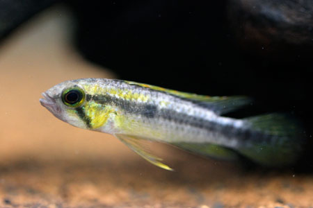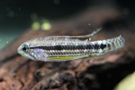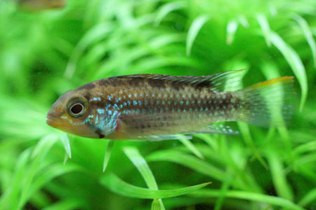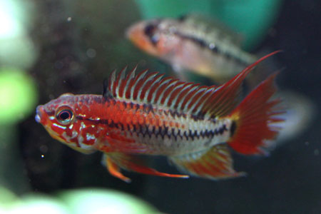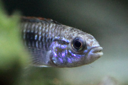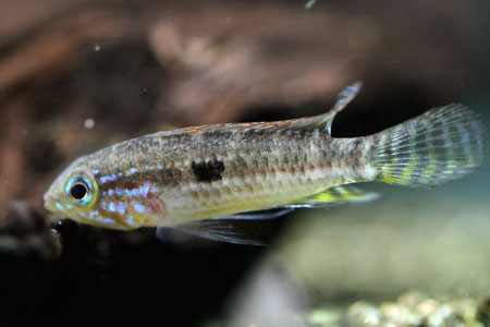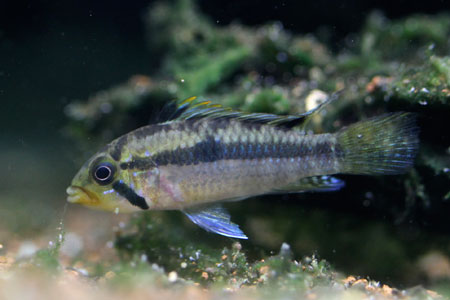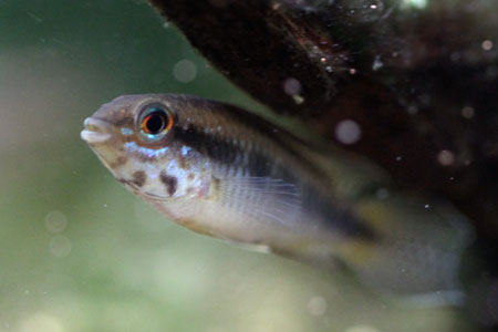 実はこの♂、12月の初産のあと、別水槽でストックしていました。親魚として再度活用しようと考えていたので、なんとか成長を抑える工夫をしておきました。雌雄サイズ差が大きくなりすぎると、少しあわせるのに苦労します。混泳水槽で、一番手にならないよう、複数のアピストのいる水槽でスタンバイしていました。あえてこのサカナの好みではない比較的低pHの水槽です。殺さず生かさず、こうしたワケです。