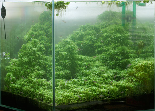 浮き草関係の様子。フロッグピットは良好に展開し、サカナの飛び跳ね防止にも一役かってくれる。この水槽では、チドメグサも使用し、少し大型の葉が、雌雄間の争いのあと一方が身を寄せる場になり、個体同士の衝突の緩和に一役かう。フロッグピットの育生状態から水槽のコンディションの一端を把握でき、これは一側面だがバロメーターとして受け止めることもできる。