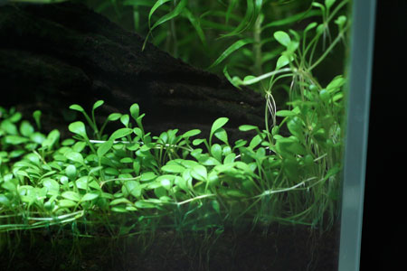 250wメタハラパワー。トニナをこの光量で育ててみたのは初めてですよ。この勢い、すごいモンですね。一気に水面に到達してしまいました。この傘のでかさは、この水槽が55キューブサイズであることを感じさせてはくれず、繊細さはみじんもなし、草の勢いのみになってしまった。パワーサンドの初期の効果も大きく、強い光量と相まってこんな様子になりました。どこまでのポテンシャルがあるのか、知るよいきっかけにもなりました。これからは数度のトリミングをくり返し、あらためて形を整えてゆきますね。