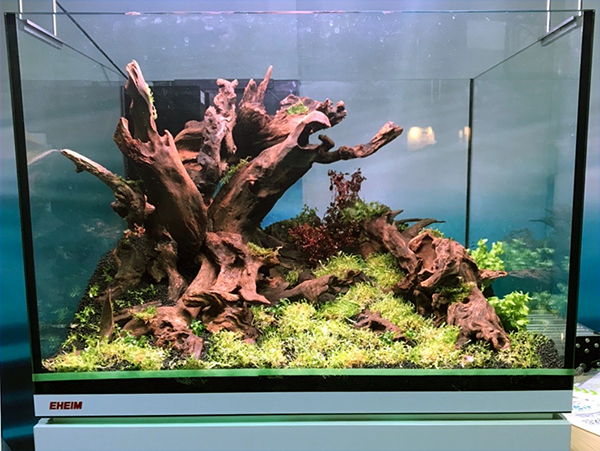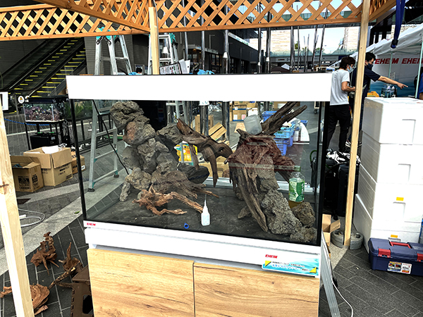 翌日の土曜日(8/20)の朝、今日からアクアリウムフェアのイベントがスタートします。開場前に、左上の流木を少し手直しし、来場の方々のあたまの上に流木が落っこちないようにと強固にさらに配慮。昨夜投入の濁り取りもしっかり効いていて、さかなの状態も良好でした。
