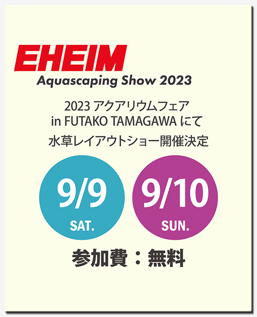 来週末の9/9〜9/10は、ニコタマ駅前で「アクアリウムフェア」があります。昨年に引き続き、入り口の水槽のレイアウトを担当しました。イベントは土日で、両日ともエーハイムのライブイベントを久々に開催します。また水草の育て方やレイアウトのコツなどを、来場のみなさま方のレベルに合わせて行います。