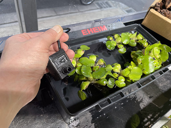 今回連れてきた「ミニホテイ」、外の気温ではまだ傷んでしまうので部屋の中。ADAの出たばかりのチビポンプをEHEIMの黒箱に水張り沈めて活用。ホテイソウが喜んでくれるはず。ADAのチビポンプの使用感は、チビ水槽であればいけてる感じで30Cだと物足りない感じ。DOOAの小さめ水槽だとちょうど良くって印象です。