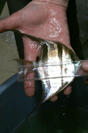 口先から尾ビレの真ん中までで7.5-9cm、十分デカいがこれで今便の小降りの中からのデカ目チョイスの結果です。このサイズは10尾連れてきていますが、無事に立ち上がるのが何尾いてくれるのかが課題。リリースはほどほど落ち着いてからになるので、少し先です。持ってきてすぐは虫下し薬浴中なので、とりあえずそこでロスらないことを今は願っています。