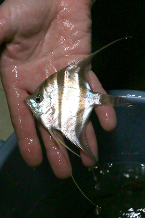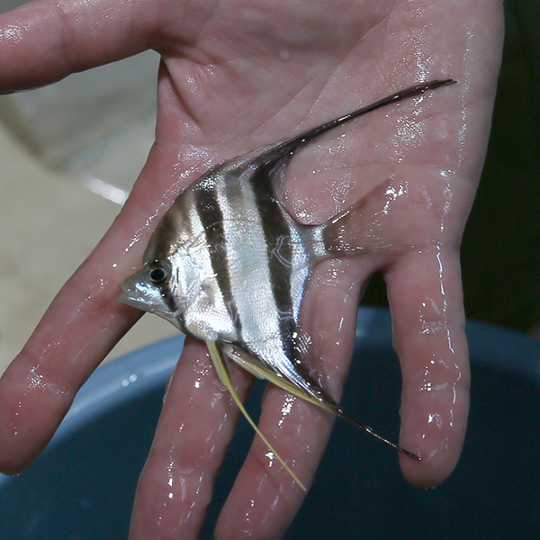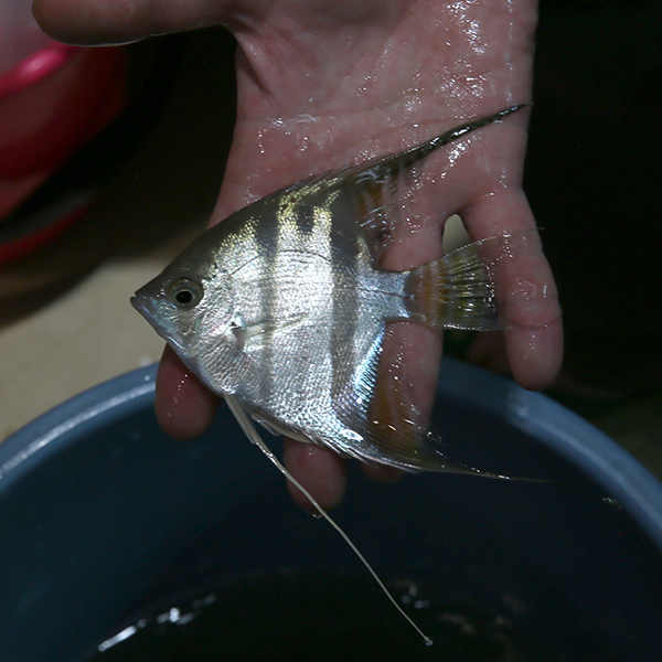一晩虫下しの薬浴して、本日タンクに収容しました。少しラリってふらふらしていますので落ち着くまでに数日はかかりそうです。今回入手の3尾とも抑えてしまいたい方はあらかじめお声がけください。そうではなくても、立ち上げて万全にしてからのお渡しとなりますのでご安心ください。天野さん家で見たアルタムと個体のイメージが近い。黒バンドが明瞭。すこしヤバ目かも。